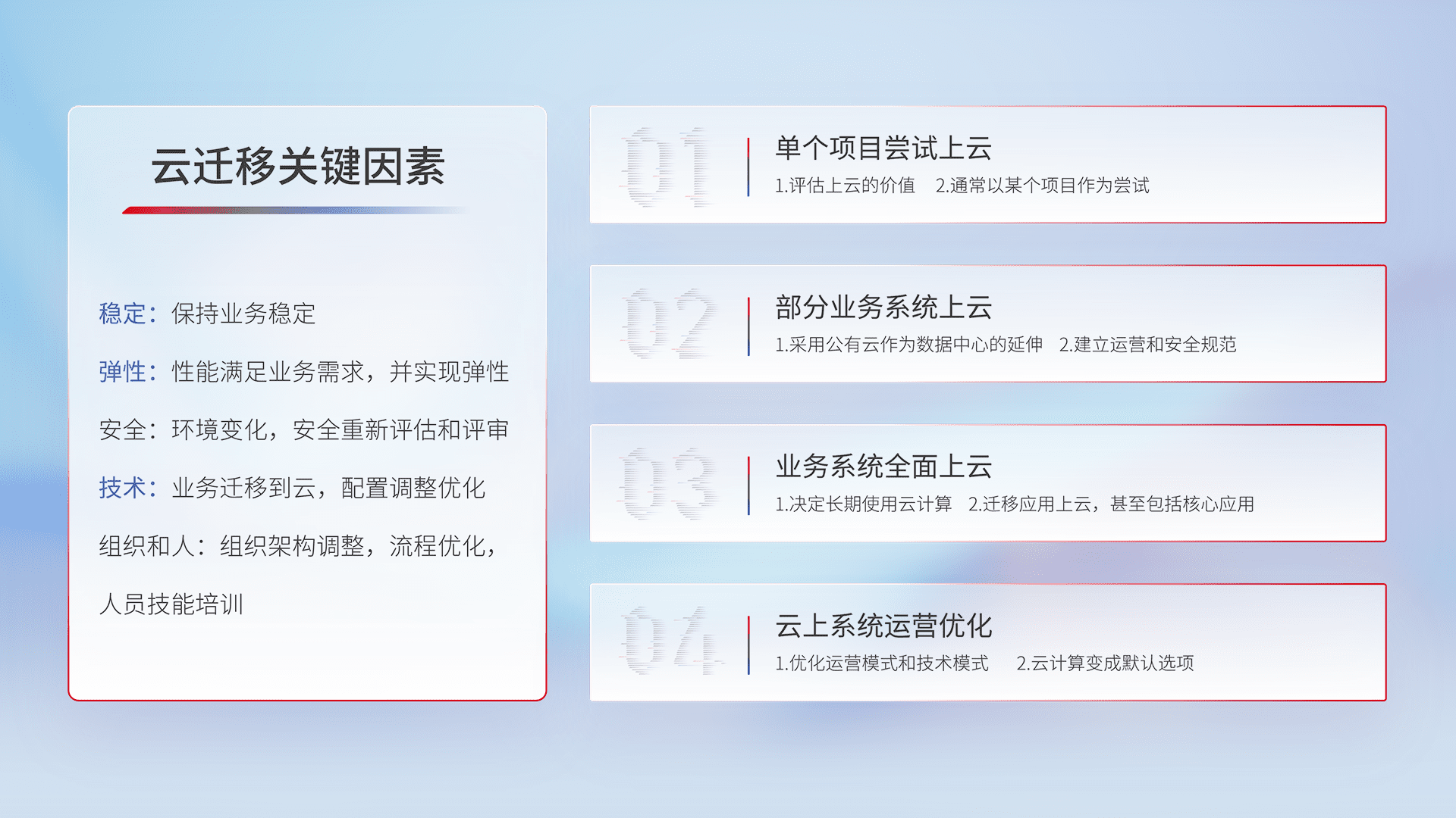 结合实际业务,,,,从规划设计、、、、云平台选型、、、、云原生改造、、、、数据迁移、、、集成交付,,迁移全过程为客户识别最佳上云路径,,,,做好风险识别管理,,,,设计网络架构、、、身份权限、、、、安全审计合规、、操作审计、、、、日志审计、、监控告警策略、、、多站点容灾设计等,,对云上基础设施进行整体规划,,提升IT治理水平,,,,以满足弹性、、、高可用、、高性能的需求。。。